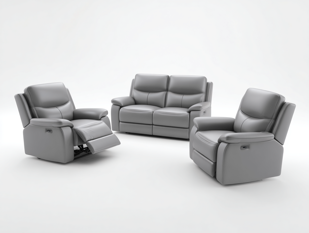 Este conjunto de sofás reclinables está diseñado para proporcionar comodidad y funcionalidad en salas de estar modernas. El conjunto incluye un sofá de tres plazas y dos sillones individuales que crean una zona amplia de descanso para reuniones familiares o momentos de relajación. Su estilo contemporáneo permite integrarlo fácilmente en diferentes ambientes del hogar.