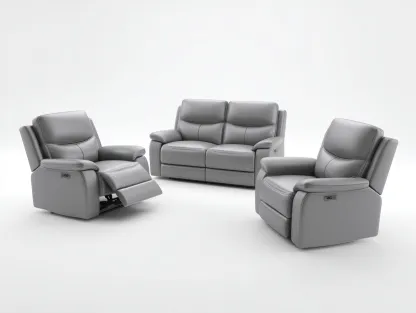 Los sofás están tapizados en material resistente de color gris con una superficie suave al tacto que aporta una apariencia elegante y fácil de combinar. La estructura interior proporciona soporte estable para el uso diario. Los mecanismos reclinables están integrados en la estructura permitiendo ajustar la posición del respaldo y mejorar la comodidad.