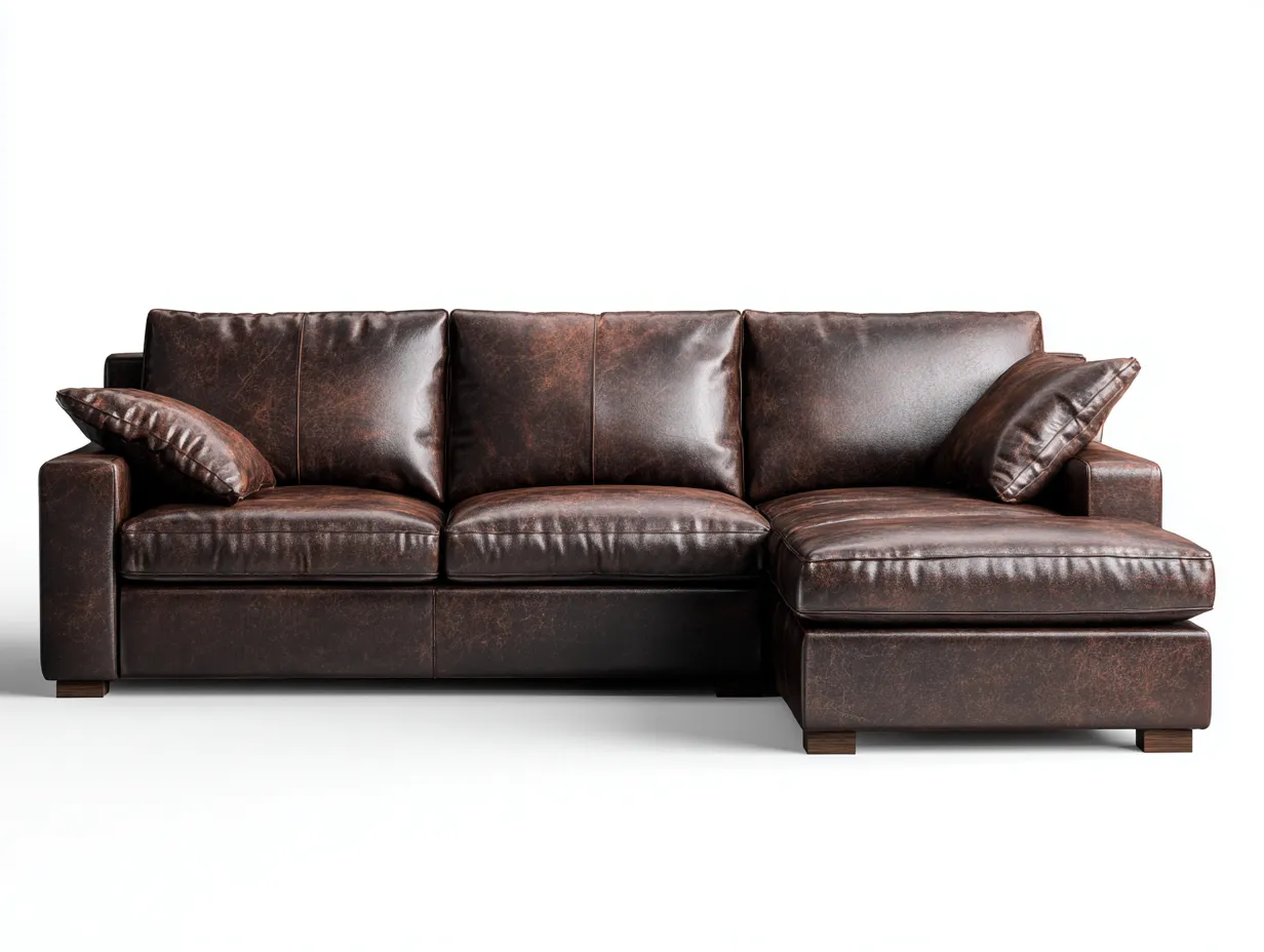 El sofá está tapizado en material resistente de color marrón oscuro con una textura que recuerda al acabado del cuero envejecido. La estructura interior proporciona estabilidad y soporte durante el uso diario. Los cojines del respaldo y del asiento están acolchados para proporcionar una superficie cómoda.
